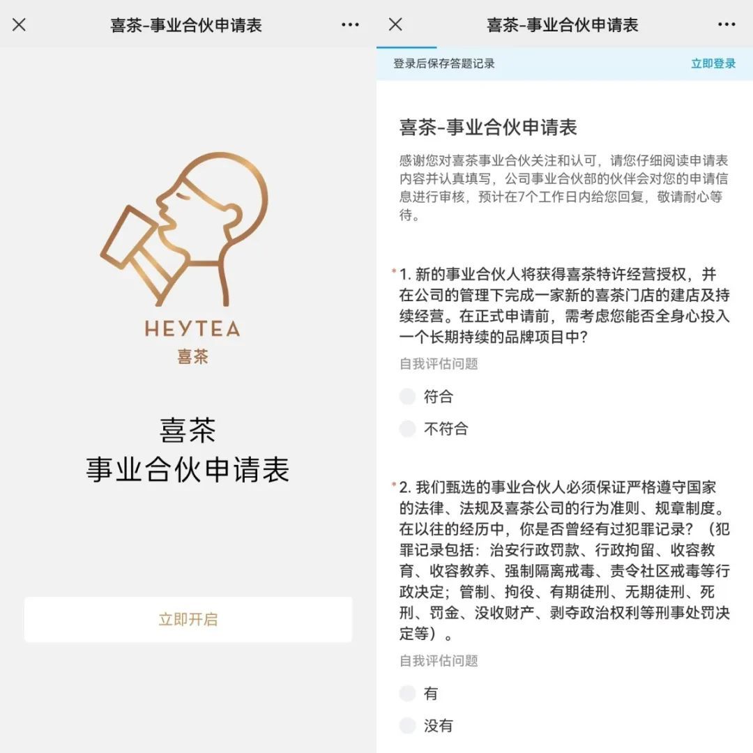 直到喜茶给出官方回应:“确实正准备在非一线城市以合适的店型开展事业合伙业务,将会在品牌、产品、品控、食安、营运、培训、供应链等方面为事业合伙人提供支持。”有人诧异,有人质疑,有人摩拳擦掌准备入局。