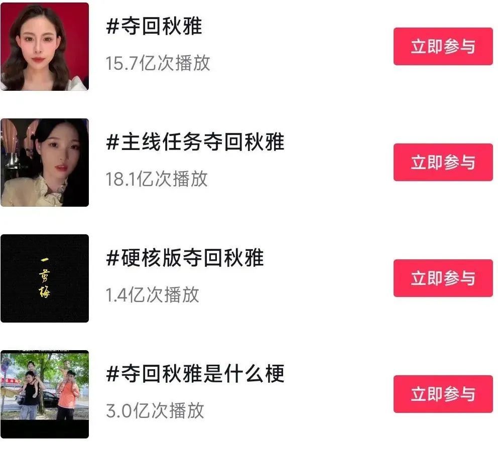 伴随这段音乐出现的,往往还有“夺回秋雅”这句不知所以但刷遍全网的热梗。截至目前,“夺回秋雅”及这段像素风旋律在抖音上的播放量突破30亿次,无数人忙着“攻略关卡”,全网都在“夺回秋雅”。连“秋雅”本人都站了出来,官方回应了这个热梗,“不用夺也会回来的”。