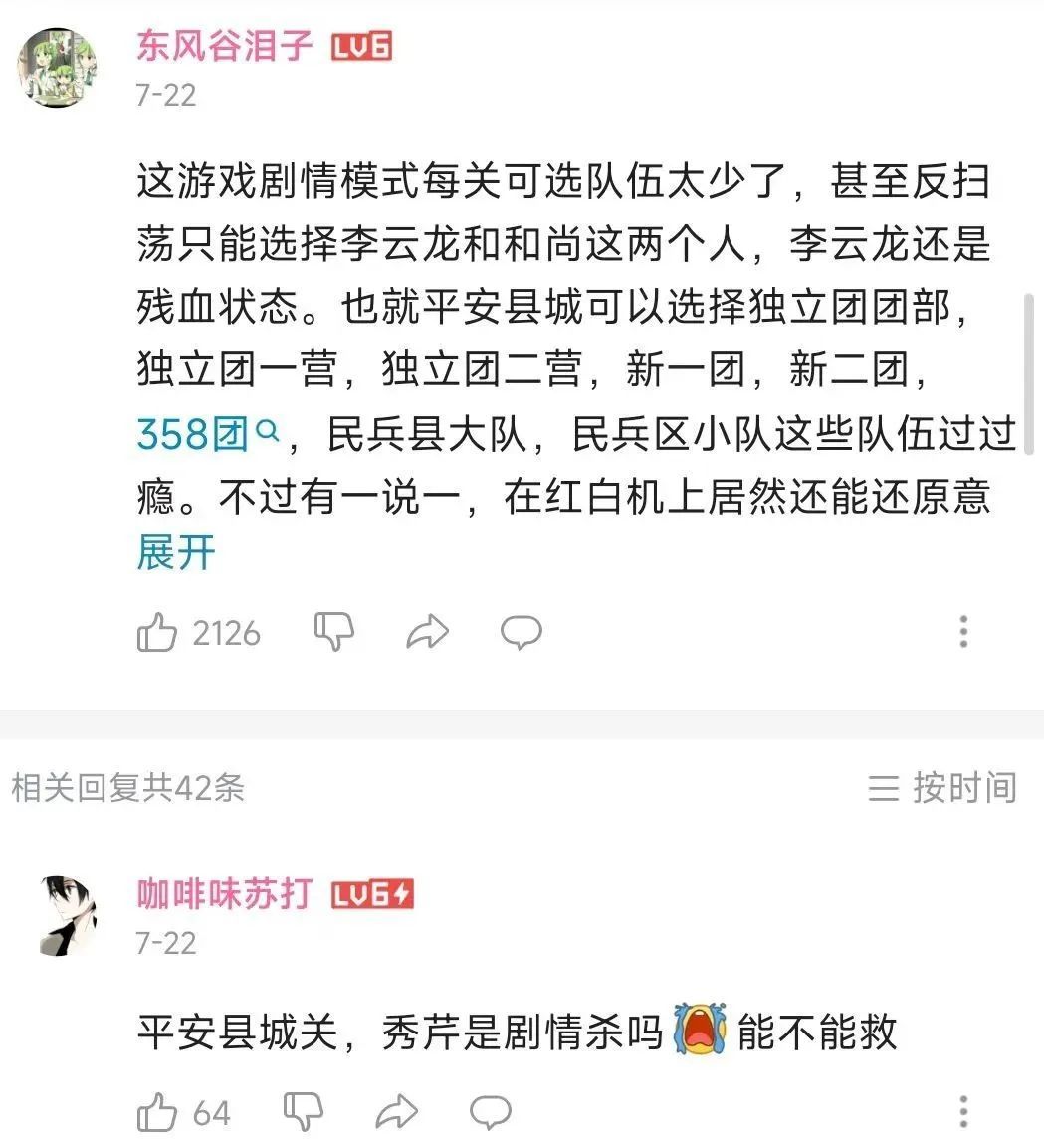 例如在《亮剑》评论区里,你能看到有人认真分享游戏攻略:“在赵家峪解救秀芹,就能避开平安县城关的剧情杀”“英雄还是要选魏和尚,重攻击很强!”,甚至有“老实人”真的信了这些“攻略内容”,在评论区里要游戏链接。