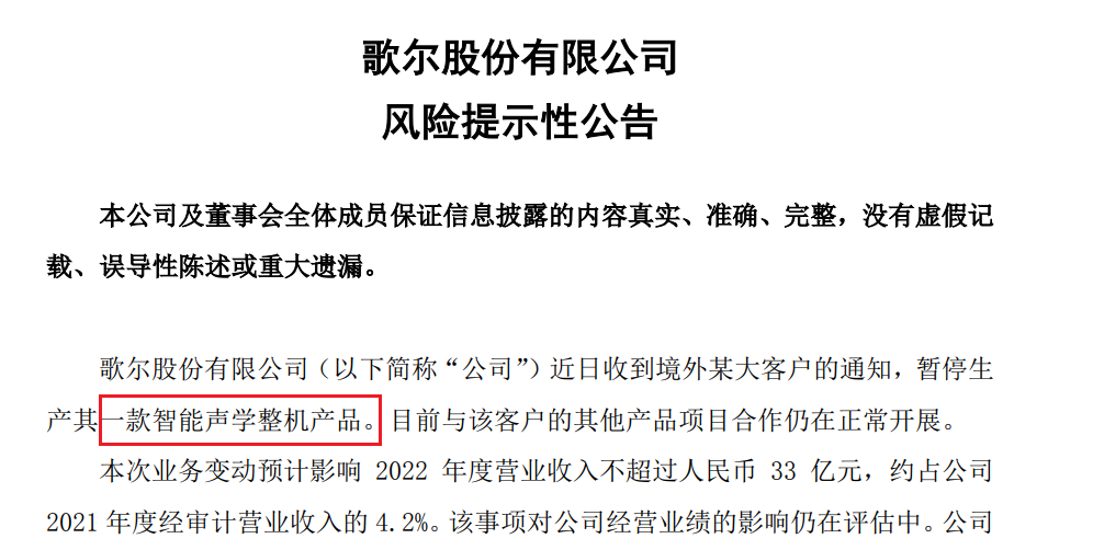 公告的核心内容在于,歌尔收到境外某大客户通知,暂停生产其一款智能声学整机产品。