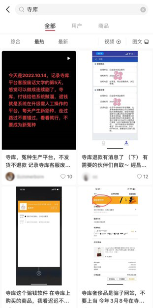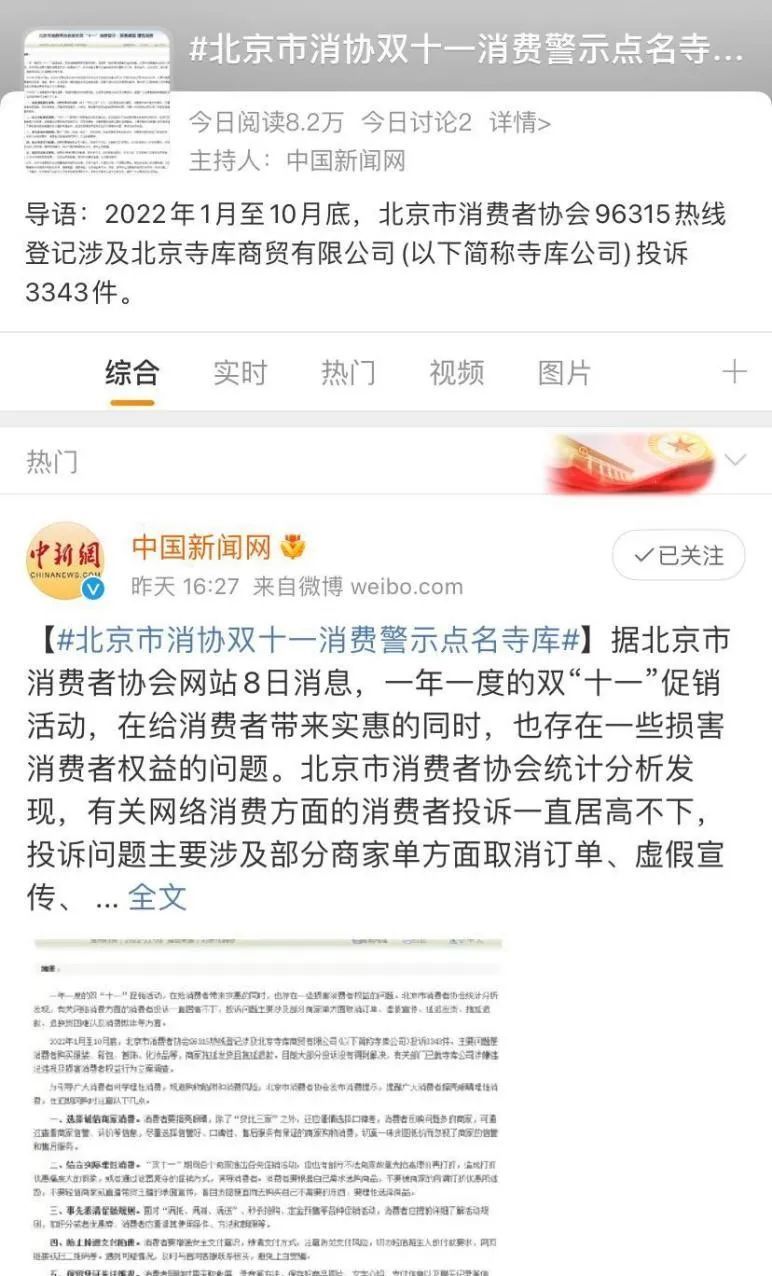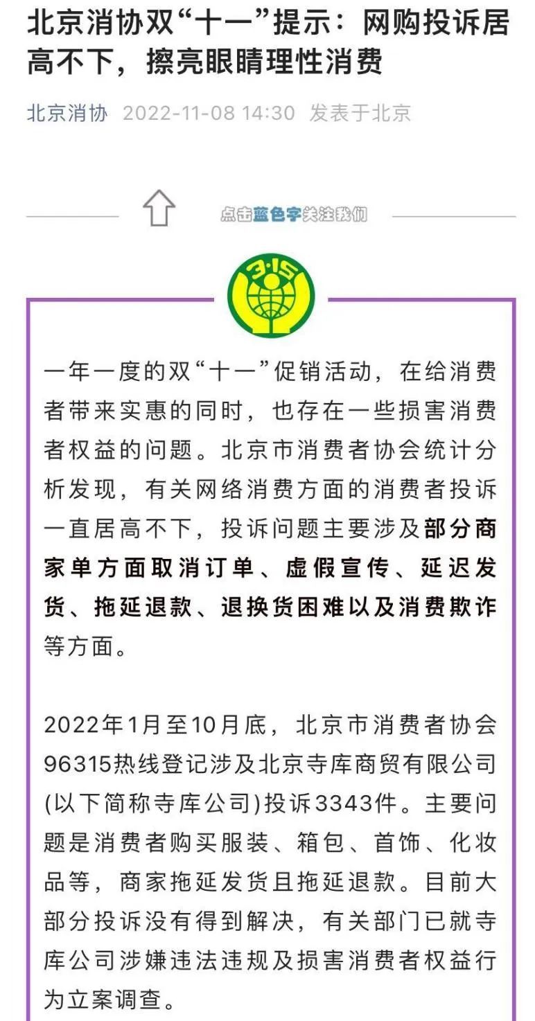 11月8日,北京消协发文称,2022年1月至10月底,北京市消费者协会热线接到有关北京寺库商贸有限公司(寺库)投诉3343件。大部分主要问题是消费者购买服装、箱包、首饰、化妆品等,商家拖延发货且拖延退款,目前大部分投诉没有得到解决,有关部门已就寺库公司涉嫌违法违规及损害消费者权益行为立案调查。