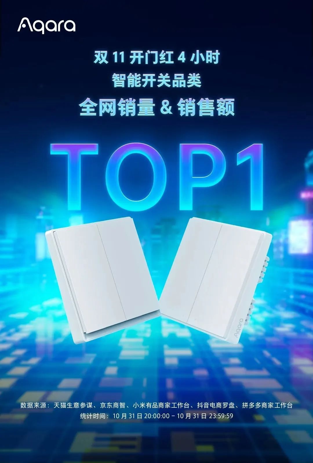 软硬生态一手抓,Aqara毫无疑问想走智能中枢的路线,这一点也能从Aqara的两冠王产品上看出。和其他专注于智能家电的智能家居品牌不同,Aqara在双十一期间的双冠王就是智能开关:Aqara是当时智能开关品类的全网销量和销售额第一,同时Aqara妙控开关S1E也是全网触屏开关单品销量和销售额第一。