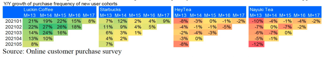 另外,和咖啡行业一对比,茶饮品行业的留存率就显得不够高。喜茶和奈雪的新用户到了一年以后购买频次都会下跌,而瑞幸和星巴克的新用户的购买频次则或多或少都在增加。这和价格无关,和奶茶产品的非刚需性相关。