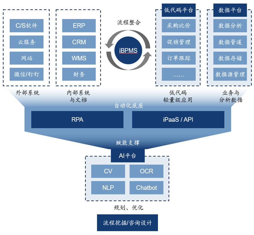 iBPM : 基于传统的BPM流程平台,增加了自动化和AI的能力,来实现部分流程的自动化;