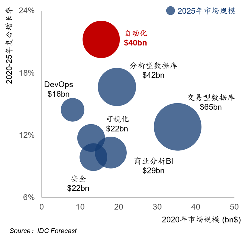 企业自动化的这些优势使得其在中国和海外均广受欢迎,根据IDC的测算,2025年全球企业自动化的潜在市场空间将达到400亿美元,在基础软件行业的几个主要赛道中发展最快。