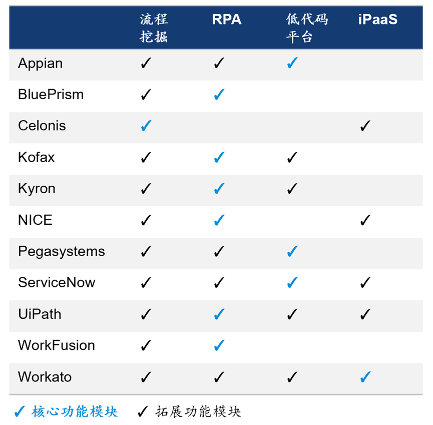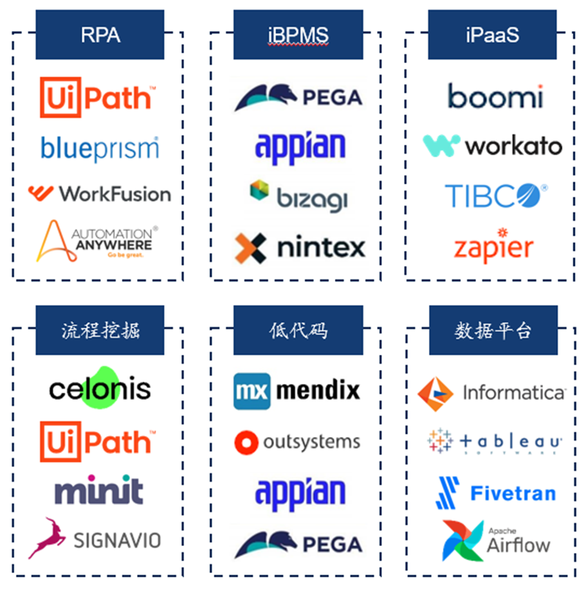 随着厂商的技术与能力半径不断扩张,各细分市场的定义和边界已经模糊,比如不少RPA厂商已经整合了AI方面的能力,而一些iPaas平台也开始提供数据管道/ETL的工具,流程挖掘与RPA之间的联动也越来越常见。