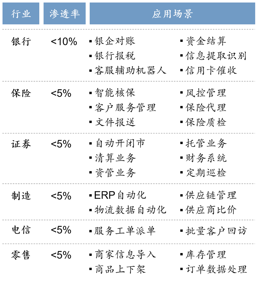 企业自动化的可应用范围极为广泛,虽然目前部署渗透率尚处于早期,但几乎绝大多数行业和职能部门都包括了大量适合自动化的业务场景。