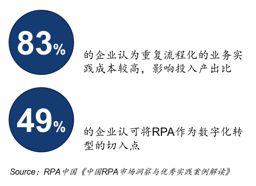 根据美国劳工统计局和麦肯锡的统计分析,各类企业员工51%的工作时间,实际上都用于数据收集、信息处理、流程操作、常规业务动作等重复性事务。这意味着巨大的潜在空间供企业自动化替代。