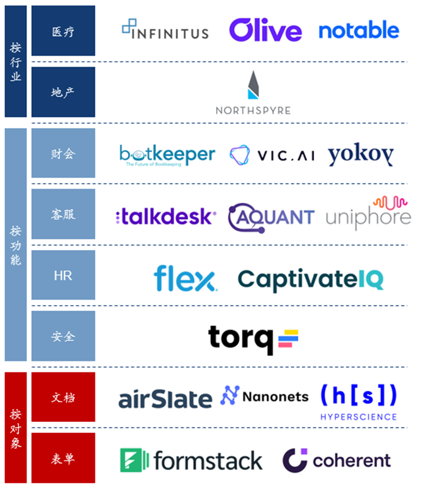 近年来专门针对垂直行业和场景的自动化应用层出不穷。以下我们仅列举了过去1-2年融资的部分厂商,其中不乏过亿甚至数亿美元融资。