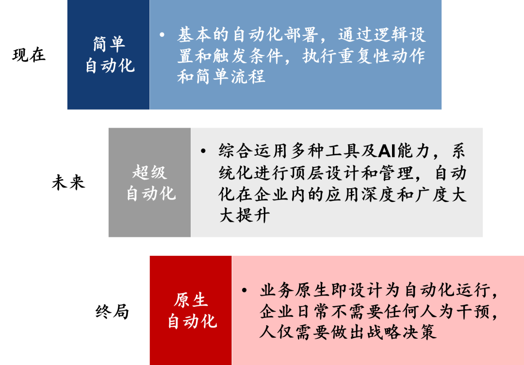 “超级自动化”(Hyper Automation)是Gartner近年提出的概念。这一概念实际上没有一个严格的定义,但确实指出了一种长期的愿景:自动化在企业中不断渗透和深入,从单一自动化工具和单点实施,到完整自动化平台和全公司整体设计,且具有高度的智能化。