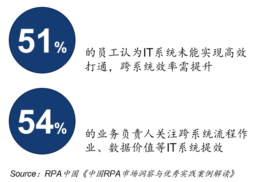 此外,客户往往也意识到不同IT系统间未能实现打通的“烟囱问题”,往往寄希望于RPA等工具来帮助完成协作和流转。