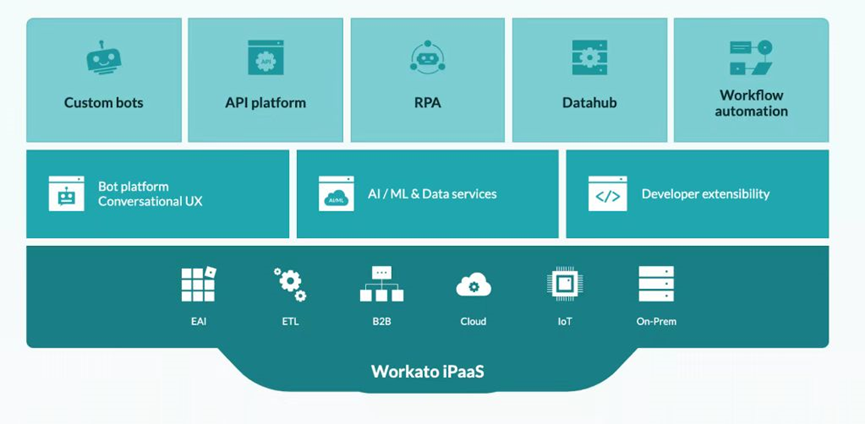 以国外厂商Workato为例,该企业以iPaas平台为基础,规划的版图里囊括RPA、工作流自动化、AL/ML平台、数据管理等绝大多数的自动化工具和能力,可谓雄心勃勃。