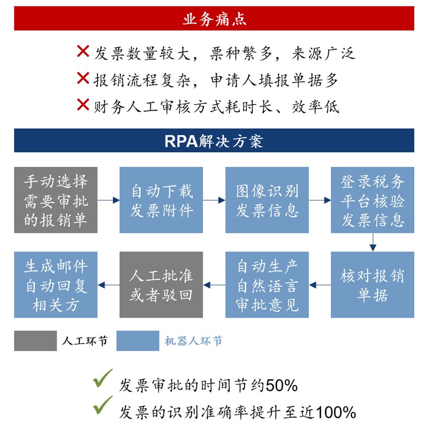 以企业财务部门最常见的发票报销流程为例,企业自动化能够极大地财务人员效率。