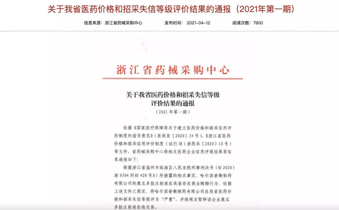 据浙江省药械采购中心通报,根据浙江省温州市瓯海区人民法院的刑事判决书(《(2020)浙 0304 刑初 428 号》)所披露的相关事实,哈尔滨誉衡制药的相关注射液在浙江省存在商业贿赂行为,将该公司在浙江省医药价格和招采失信等级评为「严重」,暂停该产品在浙江省药品采购平台在线交易。 [8]