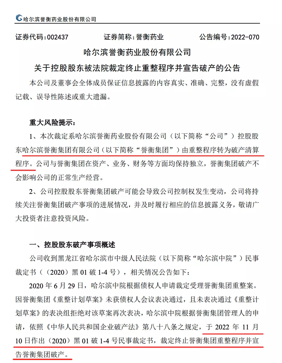 两年后,2022 年 11 月 11 日,哈尔滨誉衡药业公告称,哈尔滨市中级人民法院根据公司控股股东誉衡集团管理人的申请,依照《中华人民共和国企业破产法》规定,于 11 月 10 日作出裁定,终止誉衡集团重整程序并宣告誉衡集团破产。 [2]