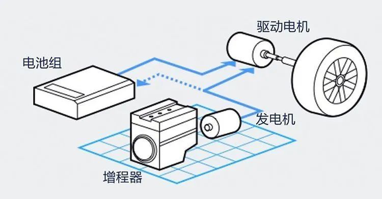 增程式电动车,属于燃油和电力混合使用的混合动力汽车的一种,原理为用发动机进行发电,电动机进行驱动的车辆。当电池组电量充足时采用纯电动模式行驶,而当电量不足时,车内发动机启动,带动发电机为动力电池充电。
