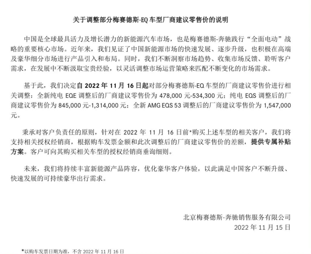 在宣布降价的同时,奔驰在公告中还表示,秉承对客户负责任的原则,针对在2022年11月16日前购买上述车型的相关客户,将支持相关授权经销商,根据购车发票金额和此次调整后的厂商建议零售价的差额,提供专属补贴方案。
