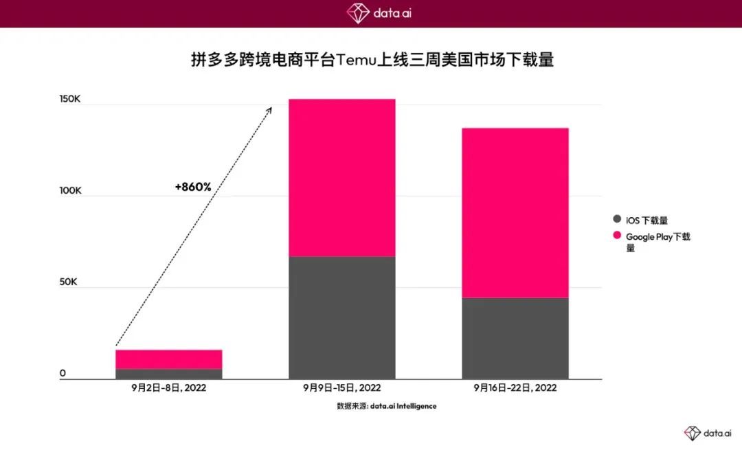 据统计,Temu上线两周内在美国市场Apple Store以及Google Play下载量均呈现百倍级别增长,9月中旬登顶美国Google Play购物类App榜首,超越亚马逊、SHEIN、沃尔玛三款常年霸占榜首的软件。