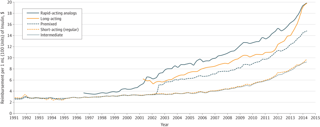 胰岛素是一种天然存在的物质,研究者无法为这种化学物质申请专利,但药企可以为每一种新的胰岛素制备方法、药剂配方等技术申请专利。过去20年间,药企不断推出专利更新、价格更高的产品,让政府和大众为之买单。从1991年到2015年,美国联邦医疗补助(Medicaid)为每单位胰岛素支付的价格增长了将近10倍 [2]。