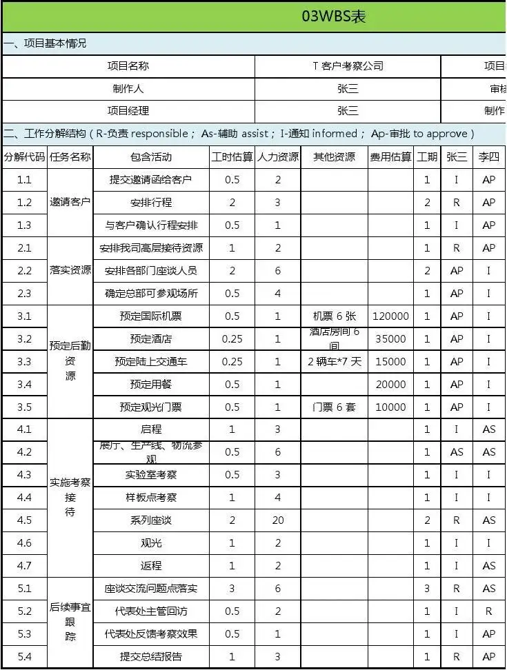 第三层之后是细节组成。就是可交付成果的形式,每项工作要包含任务负责人、时间、成本(各种资源)等内容。