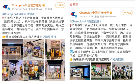 时间线上来看,永嘉集团率先将Champion引入中国,2015年Champion进驻天猫并开设官方海外旗舰店试水线上销售,并且当时是中国大陆唯一指定的经销商。2021年9月亿邦动力网的消息显示,Champion在中国加速开店,仅2020年12月份就开了8家门店,其品牌官网微信公众号显示中国市场的门店总数已增至41家。