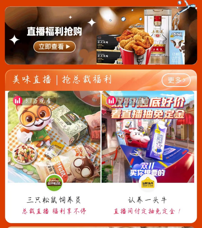 一方面,主场推荐位资源的倾斜。在本次天猫双十一预售主会场的美食榜中,三只松鼠饲养员(官方旗舰店直播间)与认养一头牛两家企业,同时登上“美味直播”子榜单。天猫官方发布“10月24日20-24点”食品行业预售成绩单中,三只松鼠顺利上榜,排名第五。