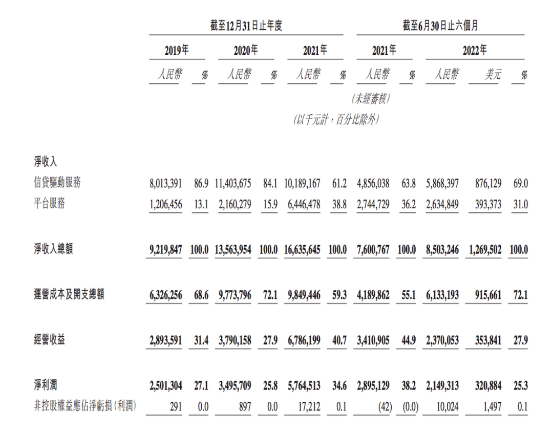 从细分业务来看,360数科主要为客户提供信贷驱动服务和平台服务。近年来,360数科通过平台服务促成的贷款规模占比不断提高,到2022年上半年达到总撮合贷款的54.8%。