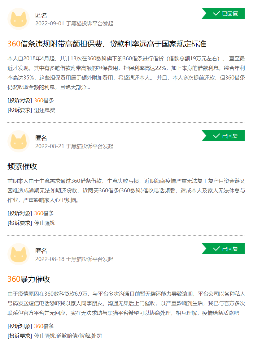 在黑猫投诉上,搜索360数科出现上百条结果,涉及高利贷、暴力催收、恶意骚扰、泄露个人隐私等多个方面。