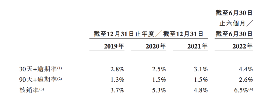 在这背后,360数科的不良率逐年提升。报告期内,公司的30天+逾期率分别为2.8%、2.5%、3.2%、4.4%,90天+逾期率分别为1.3%、1.5%、1.5%、2.6%。同时,平台撮合的所有贷款核销率分别为3.7%、5.3%、4.8%、6.5%。