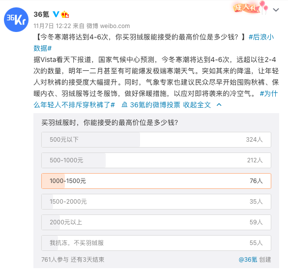 「买羽绒服时,你能接受的最高价位是多少?」的投票调查。⬇️