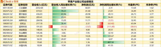 据东财Choice数据显示,截至2022年上半年,果链巨头中,营收表现最好的是工业富联,后者实现了2250.60亿元的营收,同比增长14.91%;立讯精密则以819.61亿紧随其后,增速高达70.23%,安洁科技更以407.50%的增速排名盈利增速第一名;