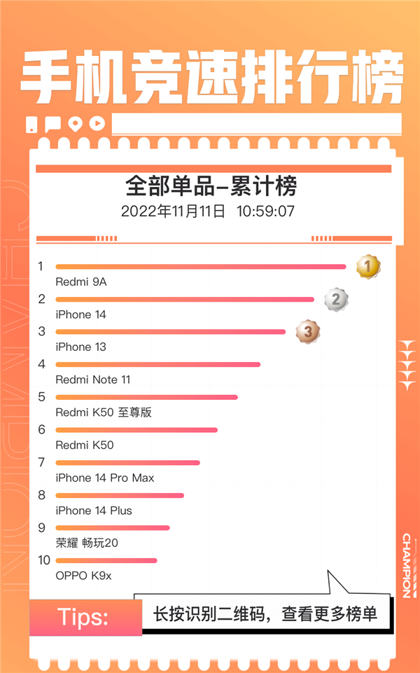 百元机Redmi 9A排在了第一位,这个很好理解,配置达到千元机标准,却只卖600多,买来送家里老人别问多合算,那你再看第二名,它是iPhone 14啊,5999起步的高端机啊,居然销量仅次于一款下沉百元机,足见有多恐怖。