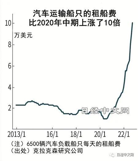 运载汽车和建筑设备的专用船只的租船费大幅上升,达到历史最高水平。10月份一天的费用是2022年初的2.6倍。这是中国的纯电动汽车(EV)出口激增,以及全球的运载船只的短缺造成的。这使受零件短缺困扰的汽车制造厂商又增加了运输船只短缺的逆风。