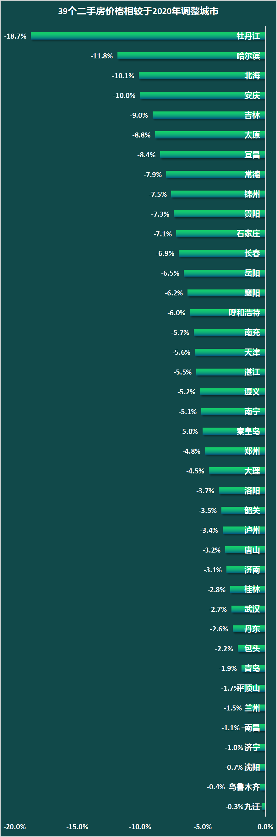 房价相比于2020年低,按照房价抛物线走势的非均匀对称关系来看,至少回到了三四年前。之所以说至少,是因为像牡丹江、哈尔滨相较于2020年跌幅超过10%,可以细品。