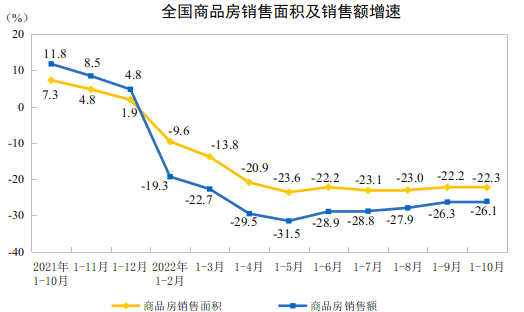 销量与销售额方面。前 10个月,商品房销售面积111179万平方米,同比下降22.3%,其中住宅销售面积下降25.5%。商品房销售额108832亿元,下降26.1%,其中住宅销售额下降28.2%。