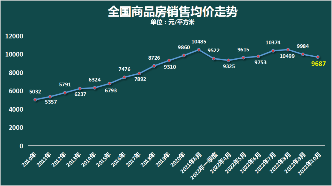 通过前10个月和前9个月的全国商品房销售面积与销售额可以计算出,10月份全国商品房均价为9687元/平方米。