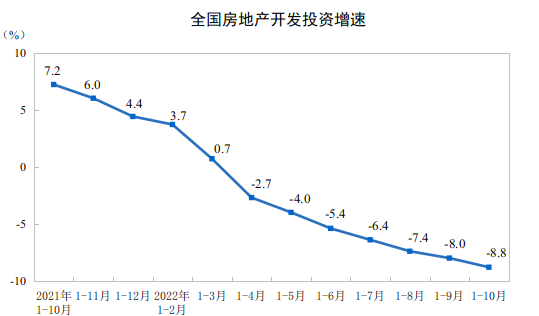 1—10月份,全国房地产开发投资113945亿元,同比下降8.8%;其中,住宅投资86520亿元,下降8.3%。