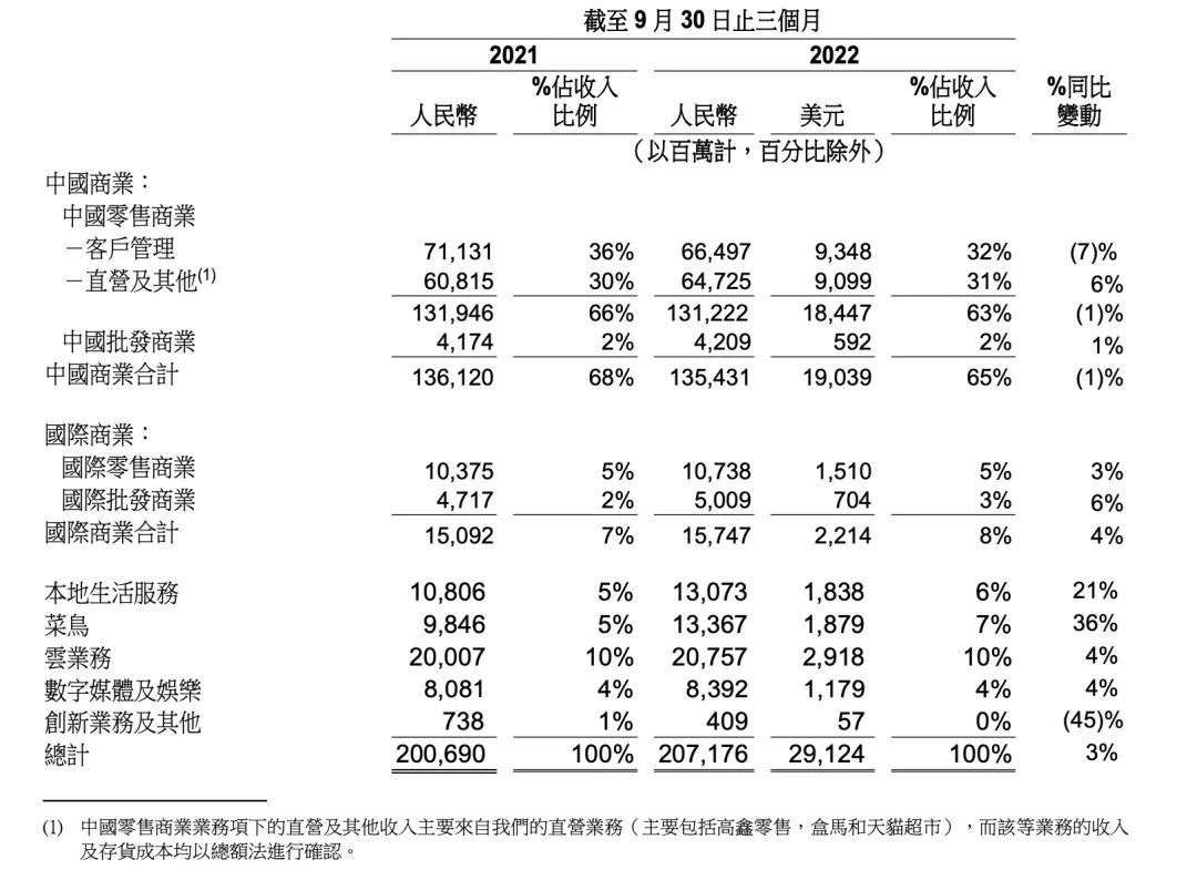 在本地生活层面,“淘菜菜”GMV同比获得了超40%的增长。盒马除掉开业不到12个月的门店外,绝大多数盒马门店的现金流为正,线上订单收入占比超65%。饿了么除了实现GMV正增长外,单位经济效益持续保持正数。