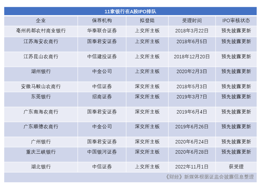 据《财经》新媒体梳理,11家在A股排队上市的银行中,湖北银行与亳州药都农商行、江苏海安农商行、江苏昆山农商行、湖州银行一起冲刺上交所主板;安徽马鞍山农商行、东莞银行、广东南海农商行、广东顺德农商行、广州银行、重庆三峡银行闯关深交所主板。
