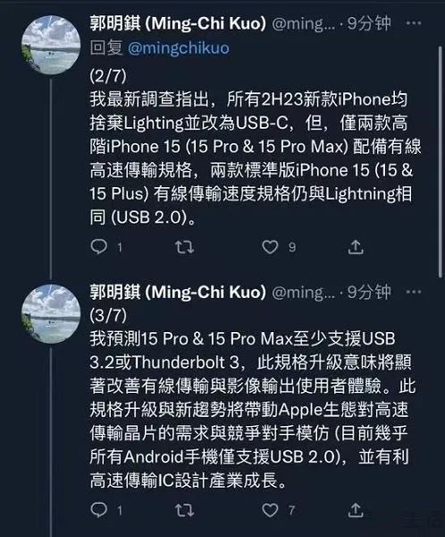 日前据分析师郭明錤的爆料显示,新款iPhone均将舍弃Lighting、并改为USB Type-C接口,但其中仅有iPhone 15 Pro与iPhone 15 Pro Max会配备高速传输规格,而另外两款机型iPhone 15和iPhone 15 Plus的有线传输速度规格则仍会与目前的Lightning接口相同。