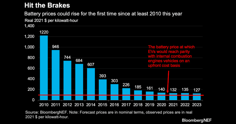 △ 电动汽车销量增长使得规模经济得以实现,加之新电池化学能量密度的提升,电池价格持续下降;由于原材料和零部件成本上涨,电池价格或自2010年以来出现首次上涨(来源:Bloomberg NEF)