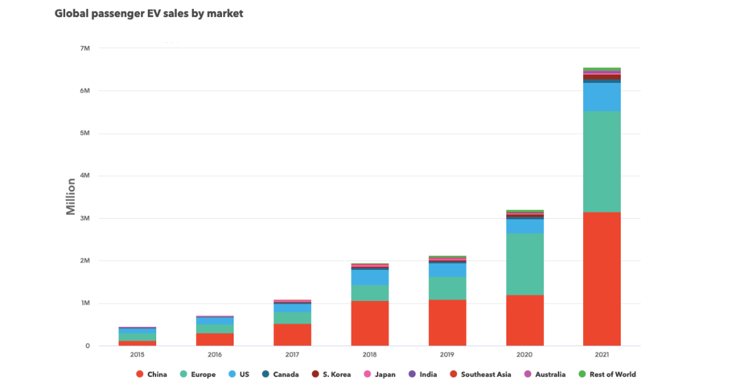 △ 2015年-2021年全球各市场乘用车电动汽车销量(来源:Bloomberg)