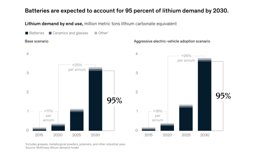 然而,McKinsey指出, 在不久前的2015年,仅有不到30%的锂需求源于电池生产 。彼时,该矿物需求主要来自陶瓷和玻璃(35%)以及油脂、冶金粉末、聚合物和其他工业用途(逾35%),“ 到2030年,电池预计将占锂需求的 95% ,总需求将以每年25%至26%的速度增长,达到330万至380万公吨LCE”。