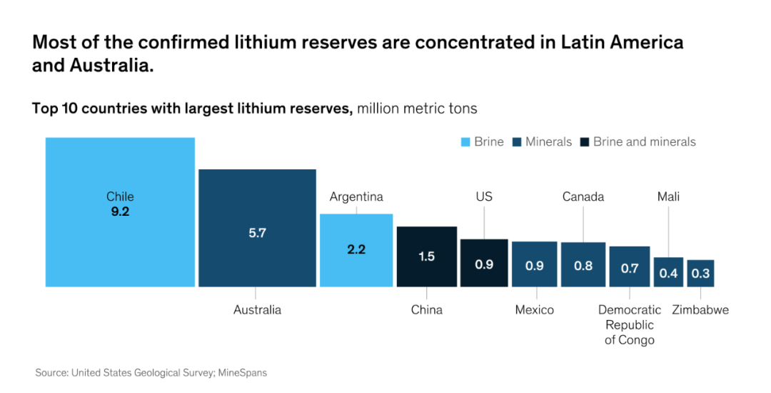 △ 2020年锂矿储量国家排名(来源:McKinsey & Company)
