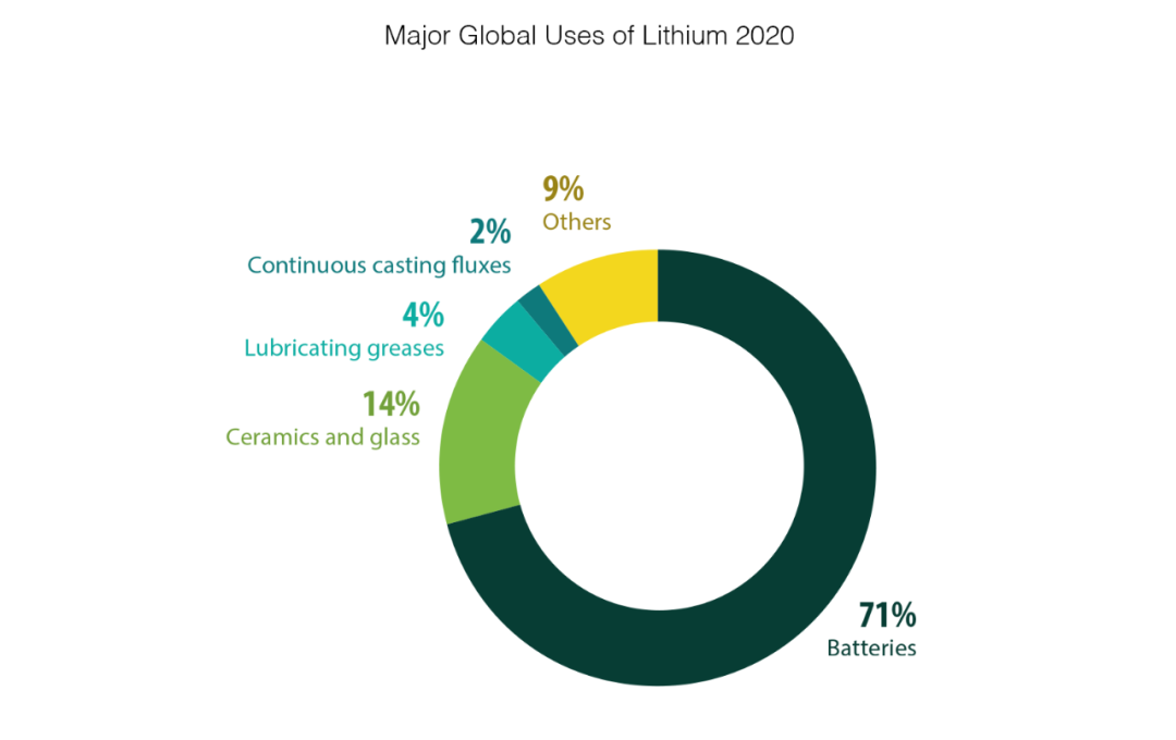 理论上看来,世界锂储量足以满足预期需求增长。然而, 这一假设建立在这样一种前提之上,即所有储备都能投入生产,并且一切储备都被用于动力电池制造,只是现实并非如此——事实是,仅有少数公司能够生产高质量、高纯度的锂化工产品;同时,并非世界上所有的锂都被用于动力电池制造,其在笔记本电脑和手机、飞机、火车和自行车等制造中被广泛应用。 2020年,用于电子产品、电动汽车和电网存储的可充电电池制造是全球锂最大的应用场景,占总需求的71% 。
