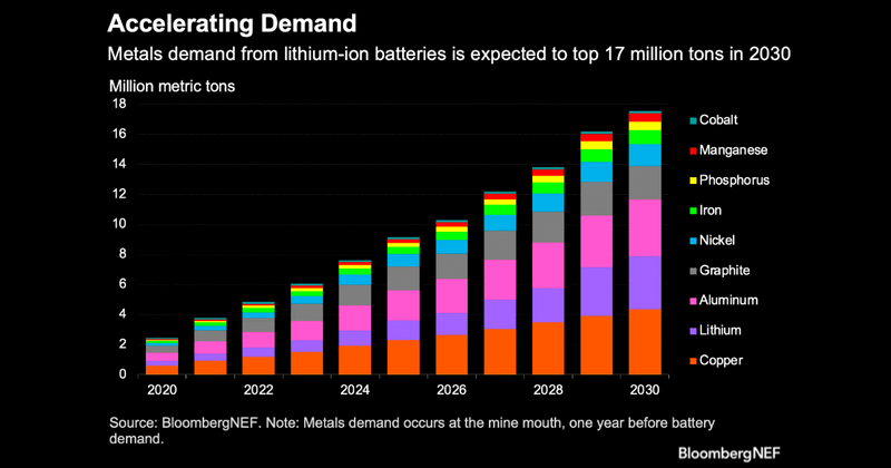 △ 2020-2030年各电池金属原料需求增长预估(来源:Bloomberg NEF)