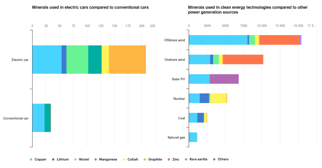 △ 左图:与传统汽车相比,电动汽车中使用的矿物;右图:与其他发电源相比,清洁能源技术中使用的矿物(来源:IEA)
