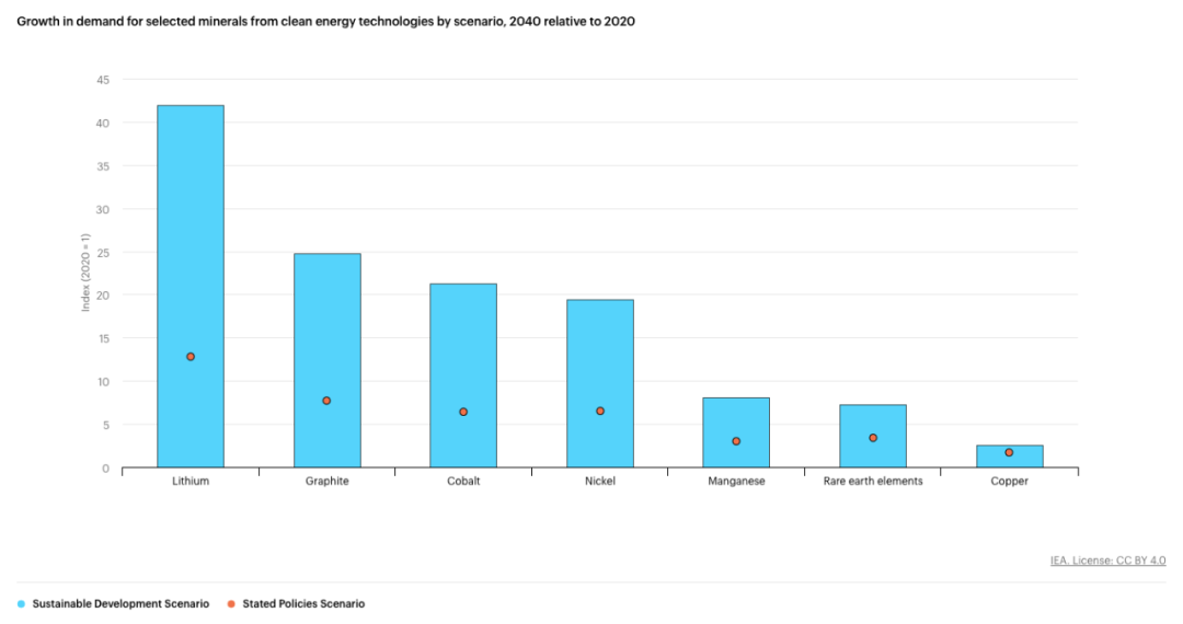 △ 2040年与2020年相比,按情景划分的清洁能源技术对特定矿物的需求增长(来源:IEA)