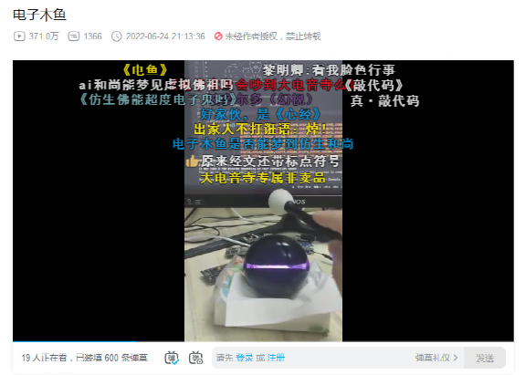 B站第一个有关电子木鱼的热门视频在今年6月就出现了。这款电子木鱼不但有LED灯光特效,还自带默写经文功能,已积累300多万点击量。