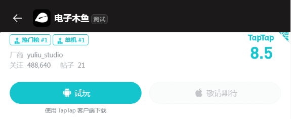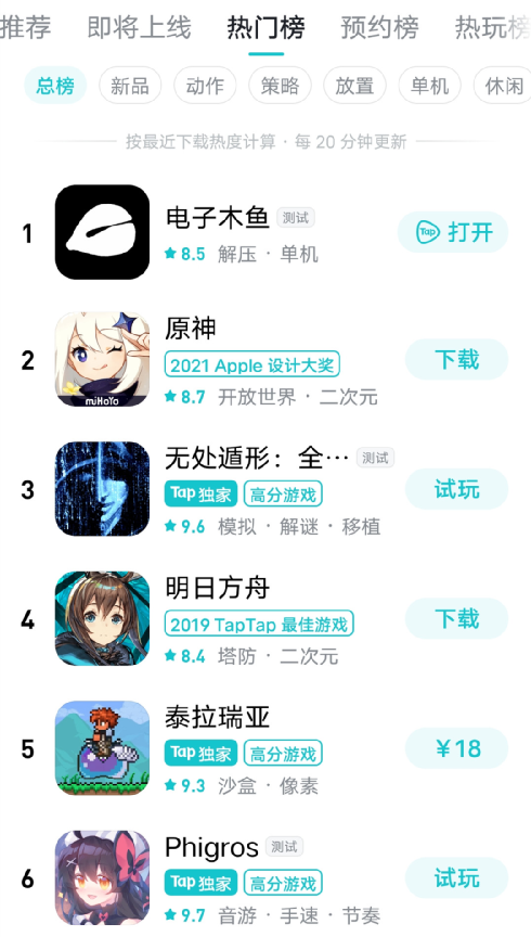 在iOS版电子木鱼火了之后,安卓平台也开始出现大量的电子木鱼。比如在TapTap平台上,从10月份开始就陆续出现了七八款电子木鱼相关游戏,其中一款名为《电子木鱼》的游戏上线后一直占据平台热门榜榜首的位置,甚至将刚刚上线3.2版本热度爆火的《原神》都压在身下。